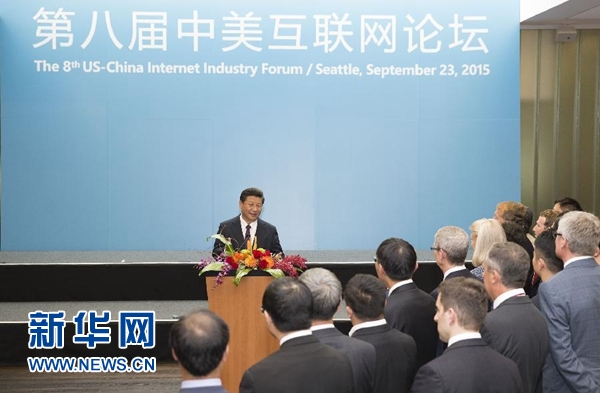 ——2015年9月23日,習(xí)近平在西雅圖微軟公司總部會(huì)見出席中美互聯(lián)網(wǎng)論壇雙方主要代表時(shí)發(fā)表講話。>>