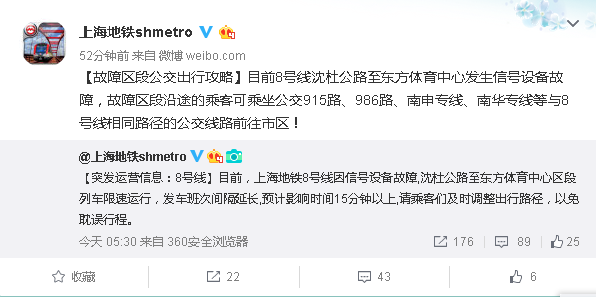 上海地鐵8號(hào)線信號(hào)設(shè)備故障 部分區(qū)段列車限速運(yùn)行