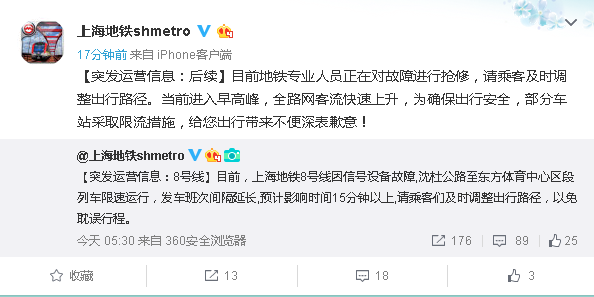 上海地鐵官微發(fā)布稱:“地鐵專業(yè)人員正在對(duì)故障進(jìn)行搶修,請(qǐng)乘客及時(shí)調(diào)整出行路徑。當(dāng)前進(jìn)入早高峰,全路網(wǎng)客流快速上升,為確保出行安全,部分車站采取限流措施,給您出行帶來不便深表歉意!”