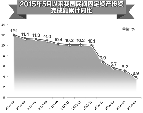 今年以來,我國(guó)民間投資增速明顯下滑。1月至5月,民間固定資產(chǎn)投資同比名義增長(zhǎng)3.9%,增速比2015年回落6.2個(gè)百分點(diǎn);民間固定資產(chǎn)投資占全國(guó)固定資產(chǎn)投資的比重為62.0%,比去年同期降低3.4個(gè)百分點(diǎn)。