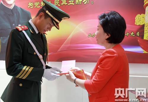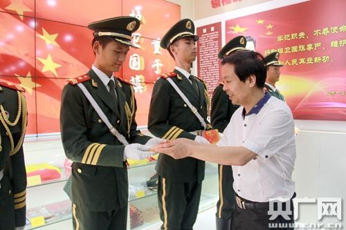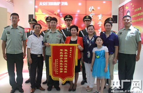 劉錦代表海南省婦聯(lián)和海南婦女群眾向國旗護(hù)衛(wèi)隊官兵致以崇高的敬意和親切的慰問,并邀請曾在軍旅生涯中榮獲過四次三等功、十一次嘉獎、對部隊有著特殊情懷的王京忠先生一道向他們贈送由海南省賦蓮婦女兒童活動中心攝制、國旗護(hù)衛(wèi)隊演唱的《忠誠》(又名《忠誠衛(wèi)士之歌》)公益音樂片視頻光盤和“魚水深情同心寫忠誠,軍民攜手共筑中國夢”的錦旗,以表達(dá)婦女群眾與部隊官兵“同呼吸、共命運、心連心”的軍民魚水情誼。政委王建華代表國旗護(hù)衛(wèi)隊全體官兵對海南省婦聯(lián)及半月談雜志社的關(guān)心和支持表示衷心感謝,并表示:“國旗是民族尊嚴(yán)的象征、是國家主權(quán)的代表,能成為國旗護(hù)衛(wèi)隊的一員是我們衛(wèi)隊每位官兵的榮譽(yù)與驕傲,我們定當(dāng)誓死護(hù)衛(wèi),不辱黨和人民賦予我們的神圣使命。”