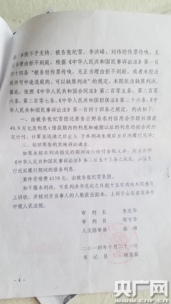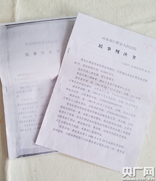 隨后,按照巨野縣法院2014年作出的判決書中載明的被告地址,記者找到了主貸款人張紀(jì)雪。這是一位50多歲的農(nóng)民,和劉偉的情況相似,他也一直不知道貸款的事。他說(shuō),自己常年靠種地和打工為生,08年正在外省打工,直到去年,才有信用社的人告訴他有個(gè)貸款,但是對(duì)方跟他說(shuō)讓他別擔(dān)心,不用他還,也不用他負(fù)啥責(zé)任,所以這個(gè)老實(shí)巴交的老農(nóng)民也就沒(méi)當(dāng)回事。