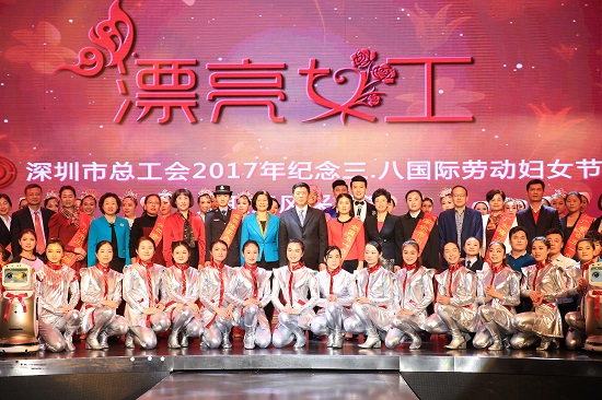 央廣網(wǎng)深圳3月6日消息(記者于揚)3月6日,深圳市總工會在深圳市現(xiàn)代輕音樂團劇場舉行深圳市總工會2017年紀念“三八”國際勞動婦女節(jié)女職工風采展演,來自全市各區(qū)、各行業(yè)的女職工代表歡聚一堂,慶祝屬于廣大勞動婦女的節(jié)日。大會表彰了先進女職工集體和個人,并向受表彰的集體、個人及部分行業(yè)女職工贈送了“在職職工女性安康互助保障計劃”,同時,啟動了深圳市總工會“2017年女職工素質(zhì)教育流動課堂”,并進行了以“漂亮女工”為主題的女職工風采展演。廣東省總工會副主席、廣東省總工會女職工委員會主任郭開農(nóng),深圳市人大常委會副主任、深圳市總工會主席喬家華及市總工會領(lǐng)導班子、市各級工會、產(chǎn)業(yè)工會領(lǐng)導出席活動。