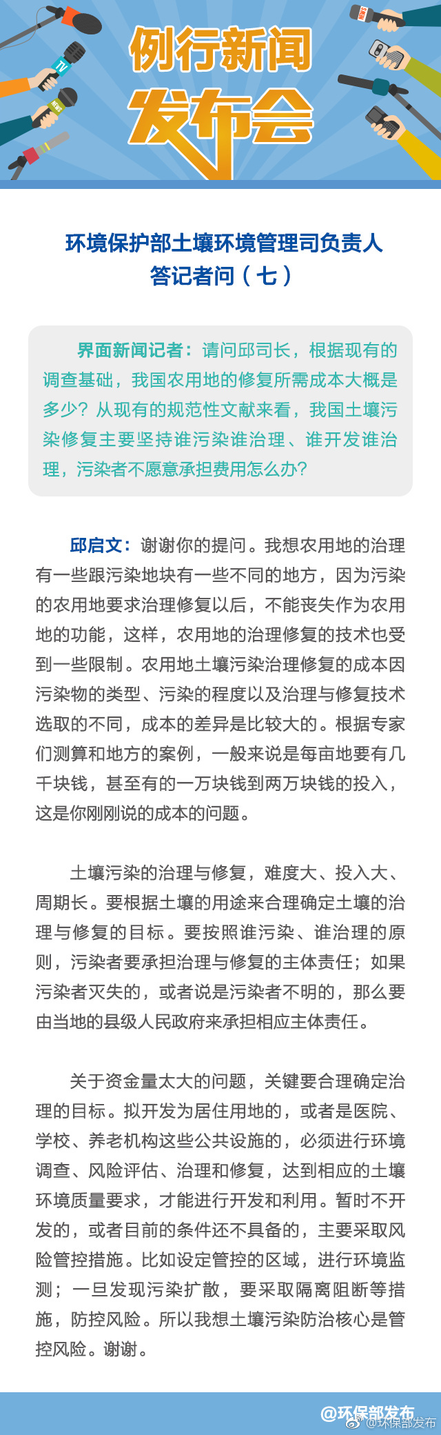 據(jù)環(huán)境保護部宣傳教育司官方微博消息,環(huán)保部土壤環(huán)境管理司司長邱啟文今日在環(huán)保部發(fā)布會上強調(diào),擬將被污染農(nóng)用地開發(fā)為居住用地,或者是醫(yī)院學校、養(yǎng)老機構等公共設施的,必須進行環(huán)境調(diào)查、風險評估、治理和修復,達到相應的土壤環(huán)境質(zhì)量要求,才能進行開發(fā)和利用。