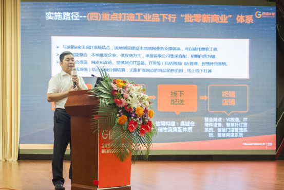 作為本次論壇的主辦方之一,中國(guó)供銷電子商務(wù)有限公司常務(wù)副總經(jīng)理戴海濤,做了題為《發(fā)揮供銷社優(yōu)勢(shì),構(gòu)建農(nóng)村電商新格局》的專題報(bào)告。在報(bào)告中,戴總以供銷e家業(yè)務(wù)定位及商業(yè)模式為例,向與會(huì)人員詳細(xì)介紹了供銷e家關(guān)于打造縣域“新商業(yè)”體系的一些成功經(jīng)驗(yàn),并匯報(bào)了平臺(tái)上線后取得業(yè)績(jī):截至今年上半年,“供銷e家”已累計(jì)建設(shè)各級(jí)運(yùn)營(yíng)中心224個(gè),村級(jí)綜合服務(wù)網(wǎng)點(diǎn)突破23,000個(gè),全國(guó)申請(qǐng)批復(fù)的地方運(yùn)營(yíng)平臺(tái)326個(gè),其中在線運(yùn)營(yíng)PC端184個(gè)、APP端132個(gè),在線商品逾7萬(wàn),全國(guó)注冊(cè)會(huì)員逾300萬(wàn),全系統(tǒng)銷售規(guī)模突破36億,預(yù)計(jì)全年實(shí)現(xiàn)80億,供銷e家已經(jīng)成為推動(dòng)農(nóng)村發(fā)展農(nóng)民增收的中堅(jiān)力量。在介紹縣域“新商業(yè)”體系時(shí),戴總重點(diǎn)解讀了聚焦農(nóng)產(chǎn)品上行和工業(yè)品下行,天網(wǎng)地網(wǎng)雙網(wǎng)支撐,兩端拉動(dòng)樹品牌、引流量、做營(yíng)銷賦能整合,構(gòu)建監(jiān)督管理體系、數(shù)據(jù)共享體系等供銷e家最核心的商務(wù)項(xiàng)目和運(yùn)營(yíng)模式。