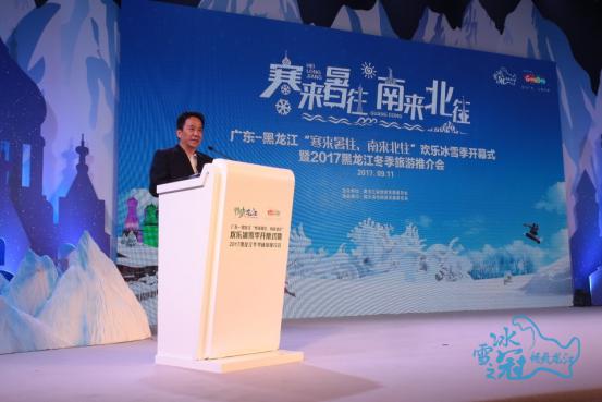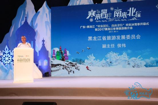 推介會開始后,廣東省旅游局副巡視員毛誠和黑龍江省旅游發(fā)展委員會副主任侯偉分別發(fā)表致辭。毛誠表達(dá)了對這場推介會的重視和肯定,他說道:“印象里,黑龍江的冬季是冰雪世界、純白的天堂,其最富代表性的‘北國風(fēng)光’和廣東有著極大的差異性。‘冰雪之冠·暢爽龍江’吸引著全國游客,特別是廣東游客心之所想、身之前往!焙顐セ仡櫫藘墒÷糜尾块T對口合作取得的成就,向大家介紹了黑龍江優(yōu)質(zhì)的冬季旅游資源,并且發(fā)出盛情邀請:“北上‘冰雪之冠’黑龍江吧,探尋未知的冰雪世界,走一趟精彩的冰雪發(fā)現(xiàn)之旅!”