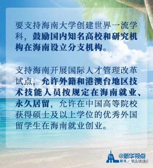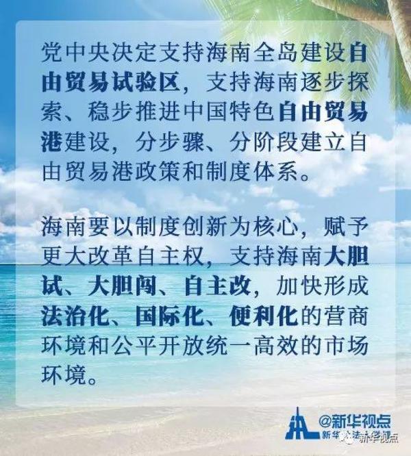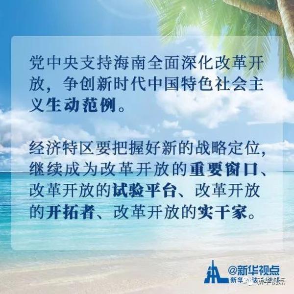 習(xí)近平總書記在講話中對海南等經(jīng)濟(jì)特區(qū)建設(shè)予以充分肯定,并就海南全面深化改革開放作出明確部署。習(xí)近平總書記指出,在內(nèi)外貿(mào)、投融資、財政稅務(wù)、金融創(chuàng)新、入出境等方面,探索更加靈活的政策體系、監(jiān)管模式、管理體制。