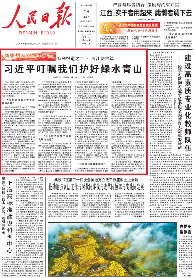 9月16日,專欄第二篇《習近平叮囑我們護好綠水青山》選在了浙江安吉,習近平在主政浙江期間,分別于2003年、2005年在此進行調(diào)研,既然欄目是“新思想從實踐中產(chǎn)生”,這一新思想已經(jīng)呼之欲出——“綠水青山就是金山銀山”,這一重要發(fā)展理念,就是習近平在安吉調(diào)研時首次提出的。人民日報記者采訪了當?shù)氐亩嗝刹咳罕,詳細講述了“兩山論”的起源。