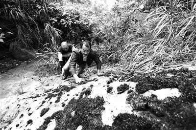 圖為向文川與駐村工作組隊(duì)員一起攀爬10余米高的石壁去檢查引流水管。
