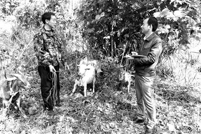 圖為向文川(右)向農(nóng)戶了解山羊養(yǎng)殖中的困難情況。
