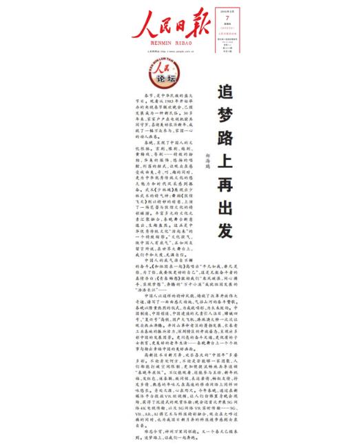 央視網(wǎng)消息:《人民日報(bào)》繼2月6日在頭版今日談欄目刊發(fā)題為《今年春晚不一般》的評論后,7日再次在人民論壇專欄刊發(fā)評論員文章《追夢路上再出發(fā)》,點(diǎn)贊2019年央視春晚。全文如下: