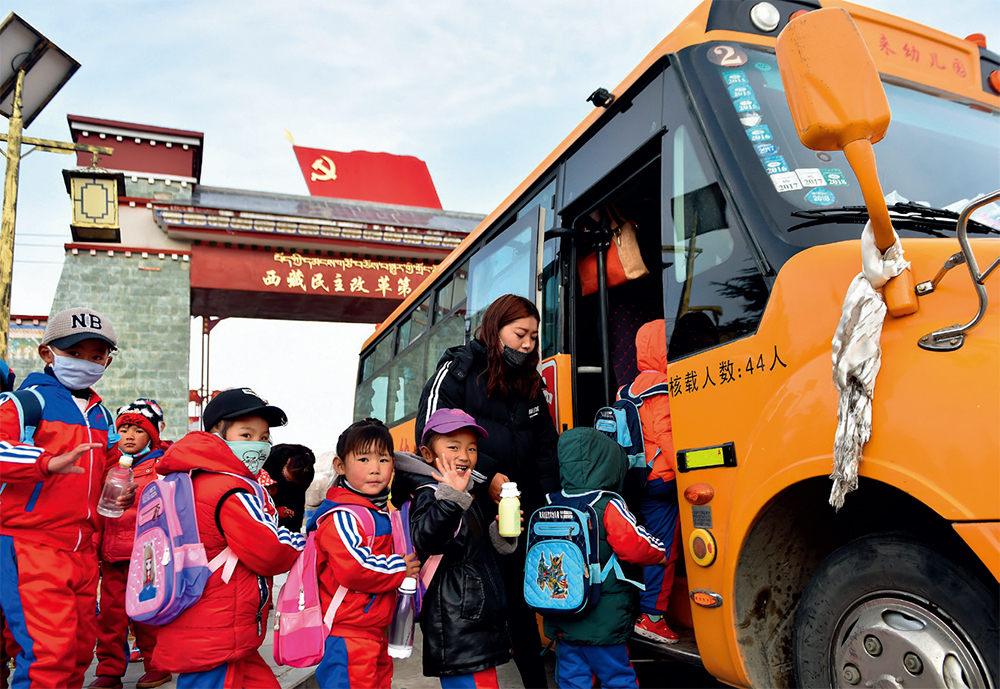 2018年3月27日,“西藏民主改革第一村”克松社區(qū)的孩子們登上校車(chē)出發(fā)去幼兒園 覺(jué)果攝