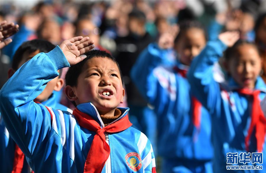 3月4日,在拉薩市第一小學(xué),少先隊(duì)員在升國(guó)旗儀式上向國(guó)旗敬禮。新華社記者 覺(jué)果 攝