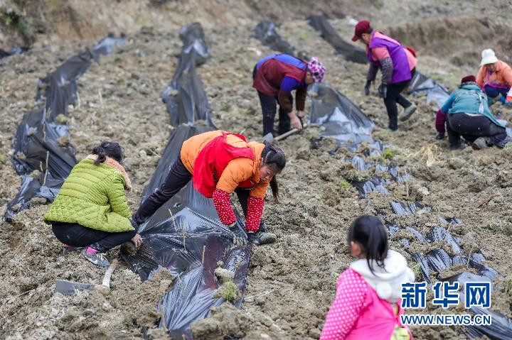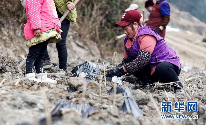 重慶黔江區(qū)金溪鎮(zhèn)長春村村民在平整出來的田地里栽種桑樹苗(1月24日攝)。
