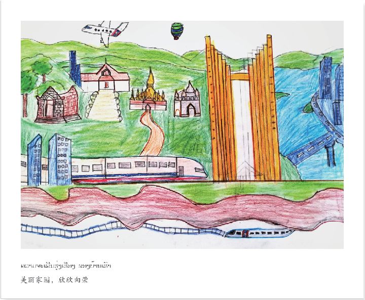58幅天真爛漫的畫作,寓意中老建交58周年的深情厚誼。孩子們希望通過畫中的學校、家鄉(xiāng)、世界和夢想,展示“一帶一路”為他們的生活帶來的變化,與習近平主席分享心中滿滿的喜悅和幸福。