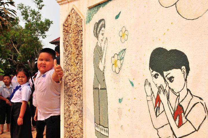 ↑2019年3月15日,中老友好農冰村小學的學生在校門口豎起大拇指。 新華社記者 章建華攝