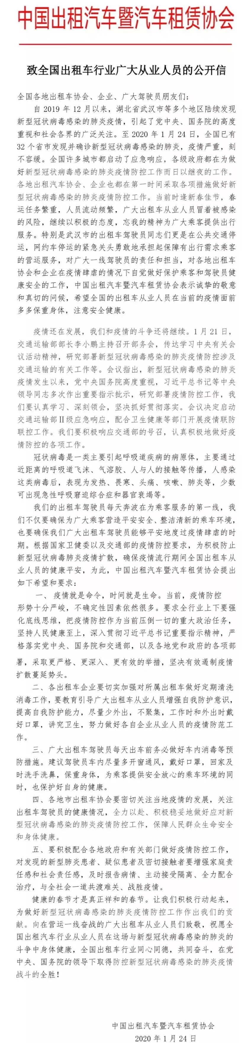 近日,中國出租汽車暨汽車租賃協(xié)會發(fā)布公開信,倡議全國出租車行業(yè)廣大從業(yè)人員把疫情防控作為當(dāng)前壓倒一切的重大政治任務(wù)。出租車駕駛員每天出車前務(wù)必做好車內(nèi)消毒等預(yù)防措施,采取更嚴(yán)格、更深入、更有效的舉措,堅決有效遏制疫情擴(kuò)散蔓延勢頭。