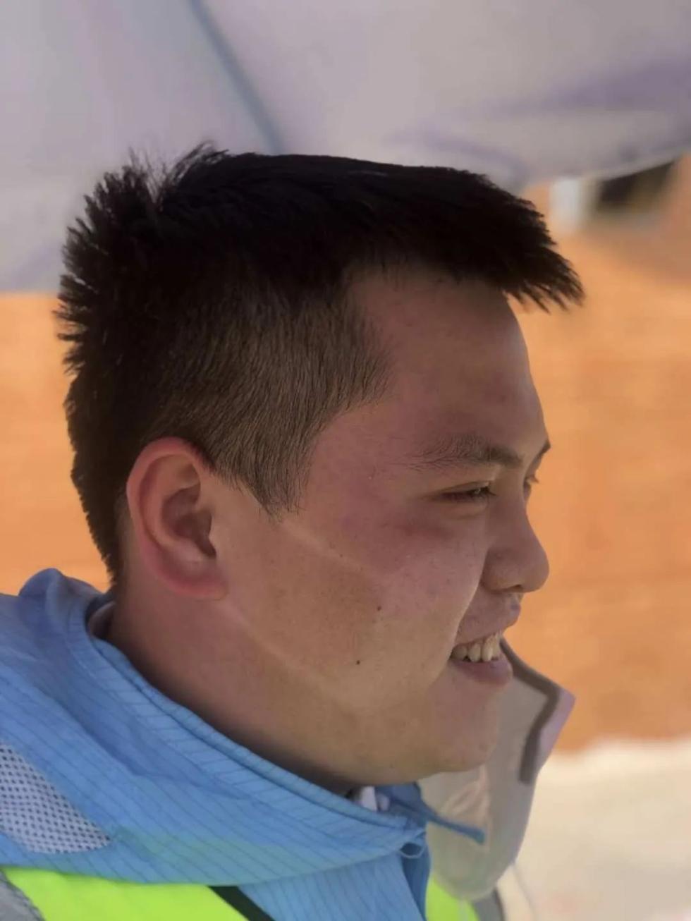 即使是站在遮陽傘底下,戴了遮陽帽,他的臉還是被曬傷了,留下了清晰可見的口罩印。疲憊的他對著鏡頭,依然露出年輕有活力的微笑。