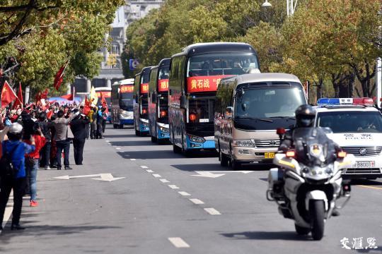 由8輛黃石警用摩托車組成的鋒矢陣開道,載有240位江蘇“白衣戰(zhàn)士”的大巴駛出磁湖山莊。一出駐地,當(dāng)?shù)厝罕娋蛫A道歡呼致謝,“感謝江蘇!”“向您致敬!”一路上紅色橫幅連綿,群眾打出黨旗、國(guó)旗,敲鑼打鼓伴隨車隊(duì)駛向高速公路路口,奔赴武漢天河機(jī)場(chǎng)搭乘飛機(jī)返程。