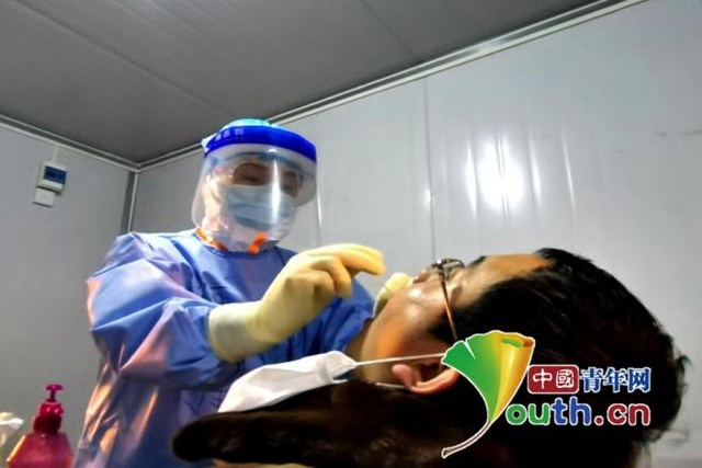 雷樂鶯給患者做咽拭子采集,圖片來自:中國青年網