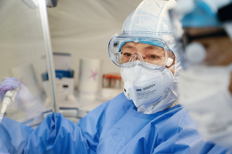 中國(guó)工程院院士、軍事醫(yī)學(xué)研究院研究員陳薇,曾在阻擊非典、抗擊埃博拉等多場(chǎng)硬仗中作出重要貢獻(xiàn)。今年農(nóng)歷正月初二,她就帶領(lǐng)專家組緊急進(jìn)駐武漢,全力進(jìn)行科研攻關(guān)。2020年3月16日,陳薇團(tuán)隊(duì)研制的重組新冠疫苗獲批進(jìn)入臨床試驗(yàn)。圖為陳薇在臨時(shí)搭建的帳篷式移動(dòng)實(shí)驗(yàn)室做檢測(cè)。 央廣軍事記者 張振威/攝