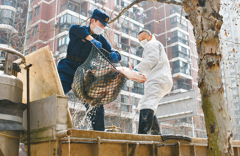 2020年3月13日,一批運(yùn)到武漢社區(qū)的活魚正在卸貨。當(dāng)日,首批100噸調(diào)配自湖北省咸寧市的活魚運(yùn)抵武漢市硚口區(qū)11個(gè)街道下轄社區(qū)。 新華社記者 程敏/攝
