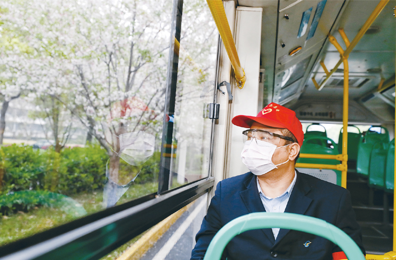 2020年3月25日,在武昌火車站綜合體站始發(fā)的首趟518路公交車上,安全員熊偉望著窗外路邊的櫻花。當(dāng)日起,武漢市部分公交車恢復(fù)開(kāi)行。 新華社記者 沈伯韓/攝