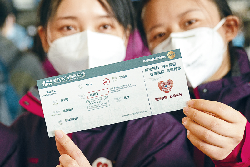 廣大醫(yī)務(wù)工作者是這次戰(zhàn)“疫”的“最大的功臣”。新冠肺炎疫情發(fā)生以來(lái),29個(gè)省區(qū)市和新疆生產(chǎn)建設(shè)兵團(tuán)、軍隊(duì)等調(diào)派340多支醫(yī)療隊(duì)、42000多名醫(yī)務(wù)人員緊急馳援湖北。隨著防控形勢(shì)逐步向好,首批支援湖北國(guó)家醫(yī)療隊(duì)于2020年3月17日踏上返程之路。圖為兩名國(guó)家緊急醫(yī)學(xué)救援隊(duì)隊(duì)員展示武漢天河機(jī)場(chǎng)特別準(zhǔn)備的“勝利號(hào)”登機(jī)牌。 新華社記者 熊琦/攝