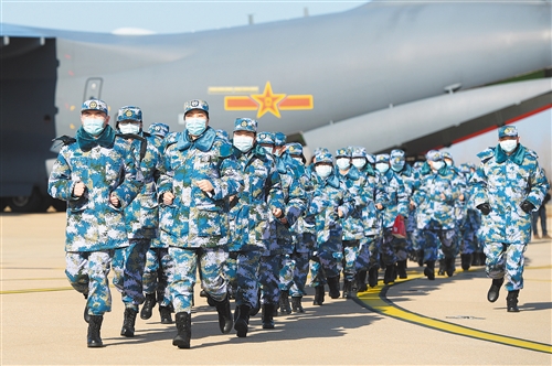 二月十七日,剛下飛機(jī)的醫(yī)療隊(duì)員列隊(duì)跑步離開(kāi)停機(jī)坪。按照中央軍委命令,二月十七日凌晨,空軍出動(dòng)包括國(guó)產(chǎn)運(yùn)-20在內(nèi)的三型八架運(yùn)輸機(jī)第四次向武漢空運(yùn)六百七十六名軍隊(duì)支援湖北醫(yī)療隊(duì)隊(duì)員和一批醫(yī)療物資。新華社記者 李賀攝