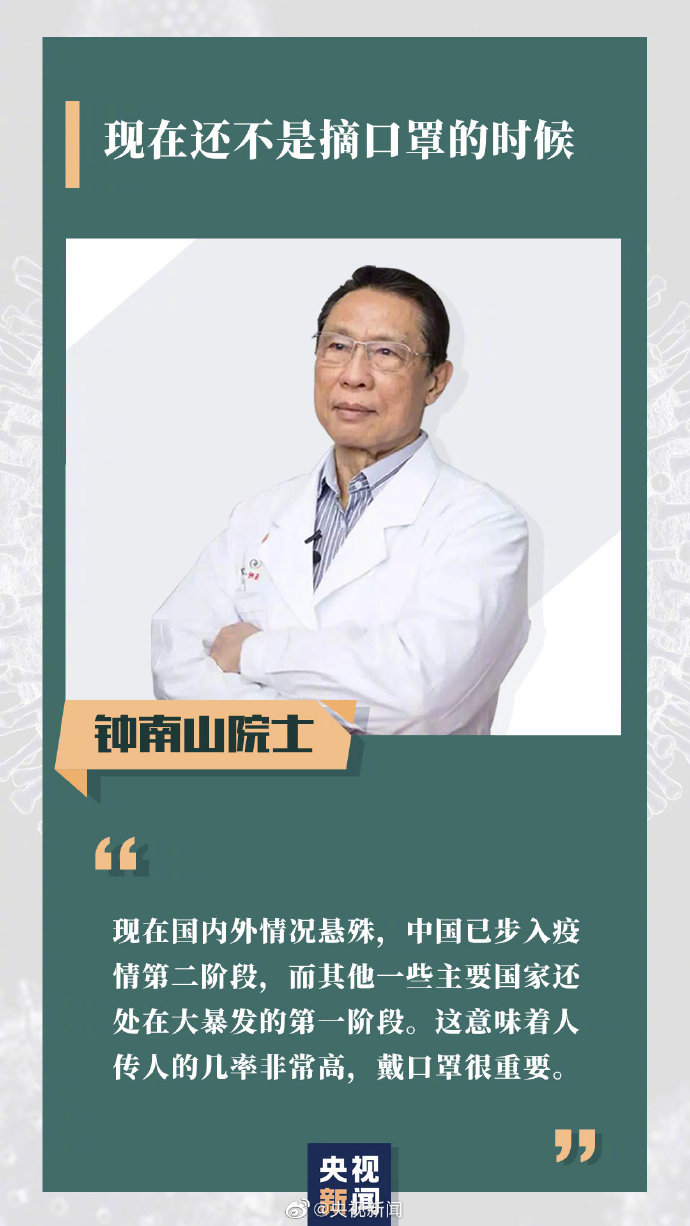 鐘南山:現(xiàn)在國(guó)內(nèi)外情況懸殊,中國(guó)由于采取了非常果斷的措施,已步入疫情第二階段,而其他一些主要國(guó)家還處在大暴發(fā)的第一階段,且仍在向上攀升。這意味著人傳人的幾率非常高,確診病例增加非?。戴口罩仍是很重要的自我防護(hù)手段,但在疫情不嚴(yán)重的地區(qū),人少的地方或空曠場(chǎng)所,倒不見(jiàn)得必須戴。