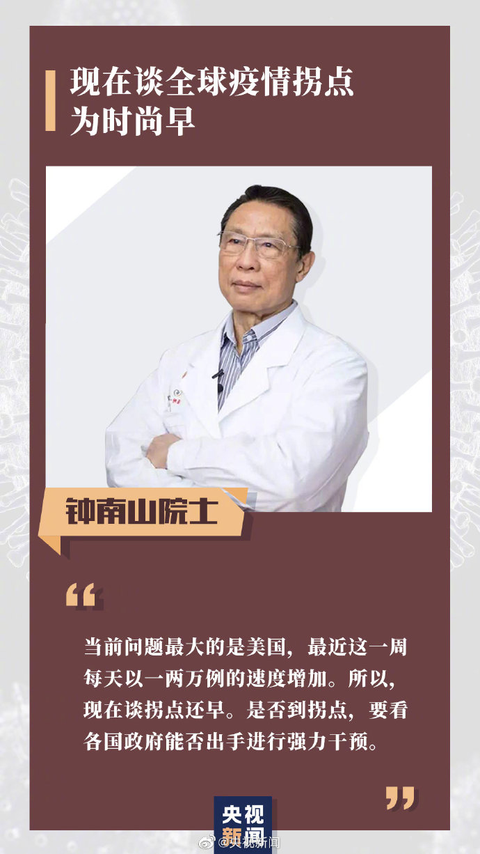 鐘南山:從全球看,原來(lái)疫情的“震中”在歐洲,特別是西班牙和意大利,現(xiàn)在還包括德國(guó)、法國(guó)和英國(guó)。當(dāng)前問(wèn)題最大的是美國(guó),最近一周,美國(guó)的確診病例數(shù)字在以每天1至2萬(wàn)的速度增加,目前預(yù)測(cè)全球疫情何時(shí)出現(xiàn)“拐點(diǎn)”為時(shí)尚早。可以說(shuō),能否出現(xiàn)“拐點(diǎn)”,主要要看各國(guó)政府能不能出手進(jìn)行強(qiáng)力干預(yù)。其他國(guó)家有很多不可測(cè)的因素,按照目前這個(gè)形勢(shì)發(fā)展下去,恐怕還需要兩周。