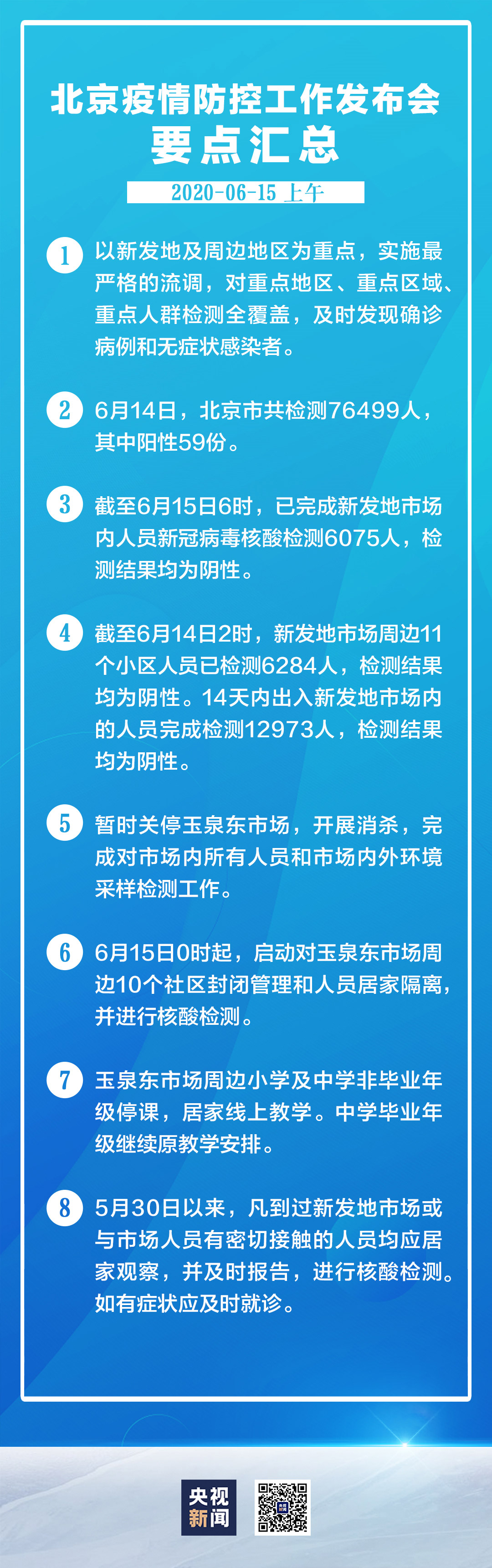 再次提示市民朋友:5月30日以來(lái),凡到過(guò)北京新發(fā)地農(nóng)貿(mào)批發(fā)市場(chǎng)或與市場(chǎng)銷售人員有過(guò)密切接觸的人員,應(yīng)主動(dòng)向單位和社區(qū)報(bào)告,并開展核酸檢測(cè)和居家觀察;如有發(fā)熱、咳嗽、咽痛等癥狀,應(yīng)向單位和社區(qū)報(bào)告并及時(shí)就近前往設(shè)有發(fā)熱門診的醫(yī)療機(jī)構(gòu)就診。