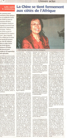 △駐馬達(dá)加斯加大使楊小茸在馬達(dá)加斯加主流媒體《午報(bào)》刊發(fā)署名文章《中國(guó)與非洲堅(jiān)定站在一起》