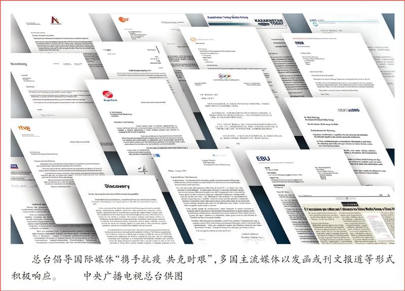 攜手抗疫、共克時(shí)艱,向國(guó)際同行發(fā)出中國(guó)媒體最強(qiáng)音。疫情發(fā)生后,習(xí)近平總書(shū)記與各國(guó)元首、各國(guó)際組織負(fù)責(zé)人等頻密溝通、深化共識(shí),以務(wù)實(shí)高效的方式有力推動(dòng)國(guó)際合作。我們緊緊跟隨習(xí)近平總書(shū)記外交步伐,積極探索創(chuàng)新媒體公共外交方式方法,以文會(huì)友、主動(dòng)作為,投桃報(bào)李、廣結(jié)善緣。1月底至3月初,總臺(tái)先后收到104家國(guó)際主流媒體和全球5家主要媒體組織負(fù)責(zé)人的慰問(wèn)信,總臺(tái)負(fù)責(zé)人逐一復(fù)函致謝,并倡導(dǎo)國(guó)際媒體同行及時(shí)、客觀(guān)、全面地報(bào)道中國(guó)的疫情形勢(shì)及中國(guó)抗疫的巨大努力和積極成效。隨著疫情在境外擴(kuò)散蔓延,3月上旬至6月底,總臺(tái)向112家國(guó)際媒體機(jī)構(gòu)負(fù)責(zé)人和32個(gè)國(guó)家駐華大使發(fā)去慰問(wèn)函,介紹中國(guó)政府積極開(kāi)展抗疫國(guó)際合作的立場(chǎng)和行動(dòng),呼吁國(guó)際媒體加強(qiáng)合作、同向發(fā)力,為戰(zhàn)勝疫情做出負(fù)責(zé)任媒體應(yīng)有的努力和貢獻(xiàn)。路透社、法新社、全俄廣播電視公司、英國(guó)廣播公司、韓國(guó)放送公社、日本廣播協(xié)會(huì)等媒體同行紛紛以發(fā)函或刊文報(bào)道等形式積極回應(yīng),肯定中國(guó)在抗擊疫情中的國(guó)際合作和大國(guó)擔(dān)當(dāng),贊賞總臺(tái)作為國(guó)際主流媒體的責(zé)任和作用,并表示愿意以此為契機(jī)與總臺(tái)加強(qiáng)包括抗疫報(bào)道在內(nèi)的多領(lǐng)域合作。