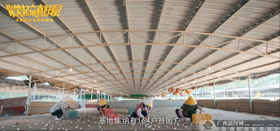貧困戶在基地里撿雞蛋。