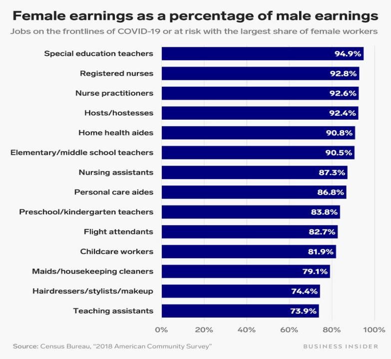 △《商業(yè)內(nèi)幕》稱,女性是抗擊新冠疫情的一線戰(zhàn)士,但美國給她們的報酬仍然不及男性