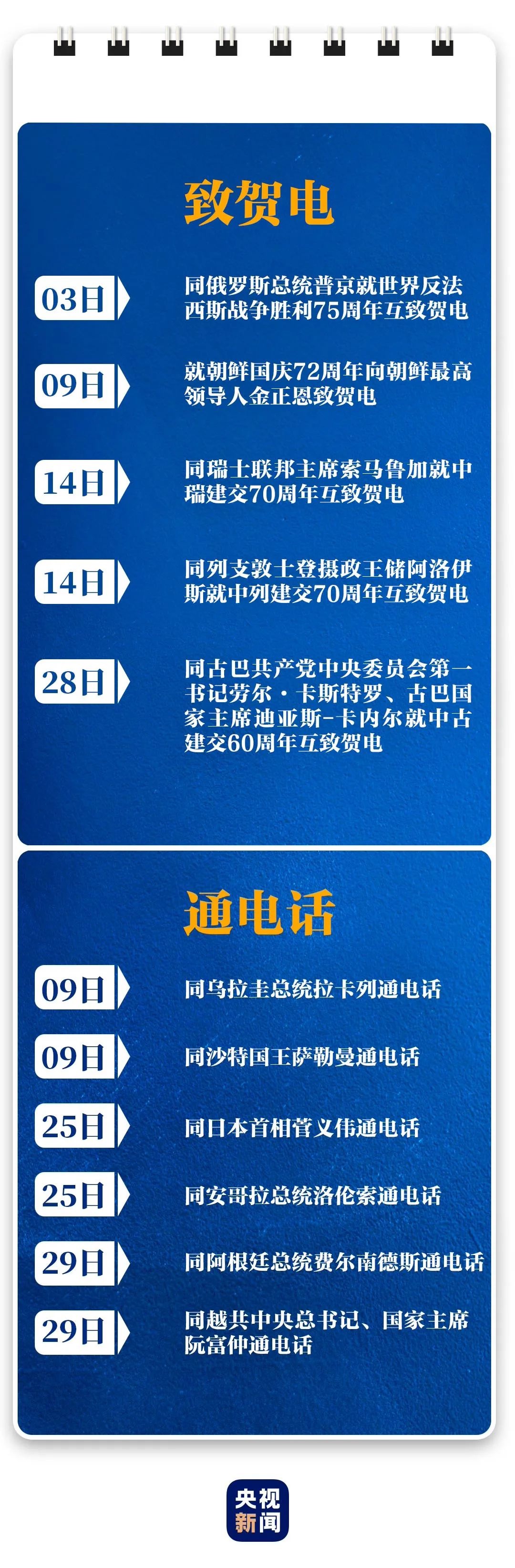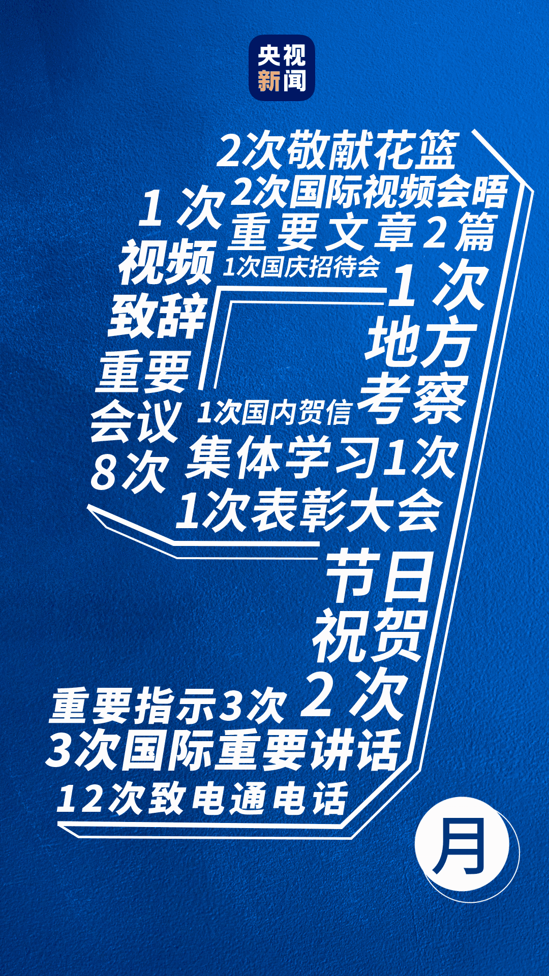 召開座談會(huì)、赴湖南考察,謀劃“十四五”時(shí)期經(jīng)濟(jì)社會(huì)發(fā)展;參加國(guó)際會(huì)議并發(fā)表重要講話、進(jìn)行外交視頻會(huì)晤、對(duì)外致電通電話,重申中國(guó)維護(hù)多邊主義的堅(jiān)定立場(chǎng);與科學(xué)家代表和教文衛(wèi)體領(lǐng)域代表座談、參加集體學(xué)習(xí),強(qiáng)調(diào)弘揚(yáng)為黨育人、為國(guó)育才的傳承精神;敬獻(xiàn)花籃、表彰英雄,為全國(guó)億萬(wàn)同胞凝聚奮力前行的力量……