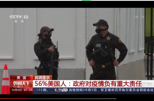 據(jù)美聯(lián)社10月5日?qǐng)?bào)道,美國(guó)最新一項(xiàng)民調(diào)結(jié)果顯示,56%的美國(guó)人認(rèn)為,美國(guó)長(zhǎng)時(shí)間深陷于新冠肺炎疫情危機(jī),美國(guó)政府對(duì)這一局面負(fù)有重大責(zé)任。