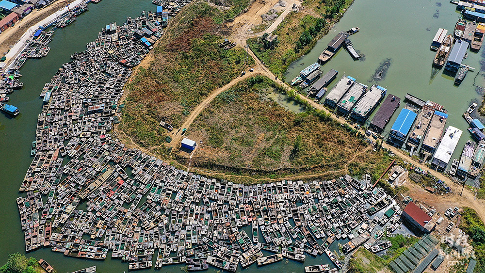 △國家實施長江流域禁捕退捕政策后,江蘇宿遷泗洪縣啟動洪澤湖水域禁捕退捕和住家船整治工作。這是聚集在漁港等待拆解的漁船。
