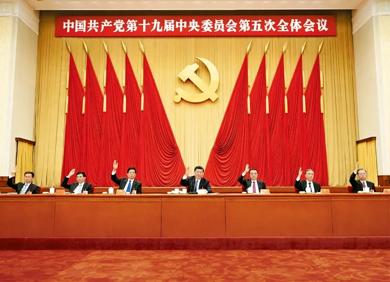中國共產黨第十九屆中央委員會第五次全體會議,于2020年10月26日至29日在北京舉行。這是習近平、李克強、栗戰(zhàn)書、汪洋、王滬寧、趙樂際、韓正等在主席臺上。新華社記者 王曄/攝