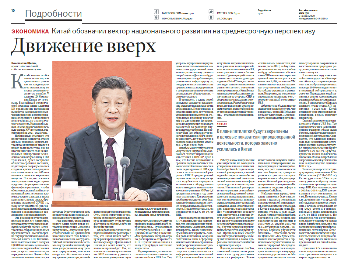 當(dāng)?shù)貢r間11月2日出版的《俄羅斯報》在《中俄銳評》專欄刊發(fā)題為《中國研究制定國家中期發(fā)展規(guī)劃 推動經(jīng)濟社會高質(zhì)量發(fā)展》的評論文章。文章以中國共產(chǎn)黨第十九屆五中全會審議通過《中共中央關(guān)于制定國民經(jīng)濟和社會發(fā)展第十四個五年規(guī)劃和二〇三五年遠景目標(biāo)的建議》為切入點,指出中國制定的雙循環(huán)新發(fā)展格局在擴大內(nèi)需的同時將一如既往地推進對外開放政策。文章強調(diào),中國將持續(xù)加大科技創(chuàng)新投入,擺脫在某些關(guān)鍵領(lǐng)域的技術(shù)依賴。同時,未來五年中國將更加重視高質(zhì)量發(fā)展與綠色發(fā)展。
