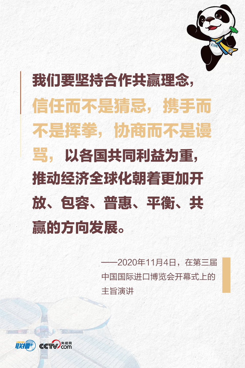 “要堅(jiān)持合作共贏理念,信任而不是猜忌,攜手而不是揮拳,協(xié)商而不是謾罵,以各國(guó)共同利益為重,推動(dòng)經(jīng)濟(jì)全球化朝著更加開(kāi)放、包容、普惠、平衡、共贏的方向發(fā)展”,“各國(guó)走向開(kāi)放、走向合作的大勢(shì)沒(méi)有改變”。