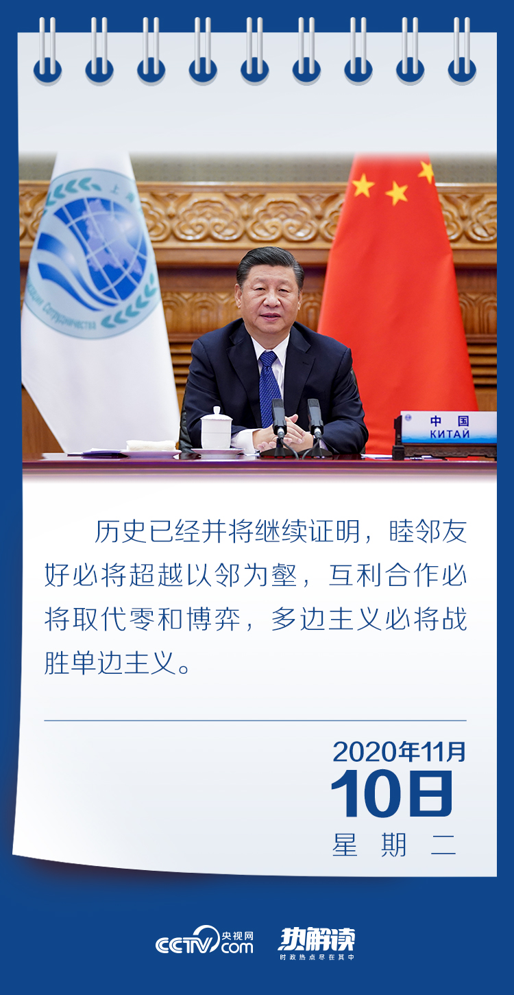 11月10日晚,習(xí)近平主席以視頻方式出席上海合作組織成員國元首理事會第二十次會議,并發(fā)表題為《弘揚“上海精神” 深化團結(jié)協(xié)作 構(gòu)建更加緊密的命運共同體》的重要講話。