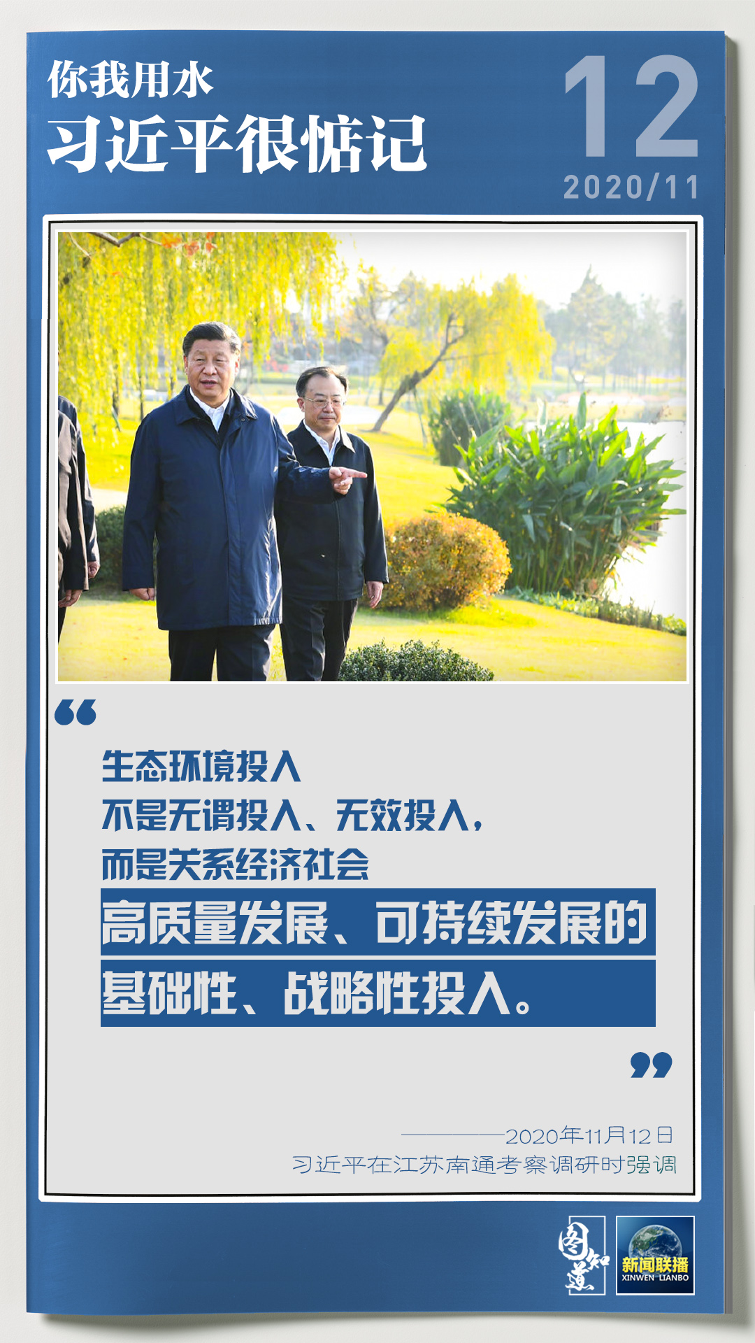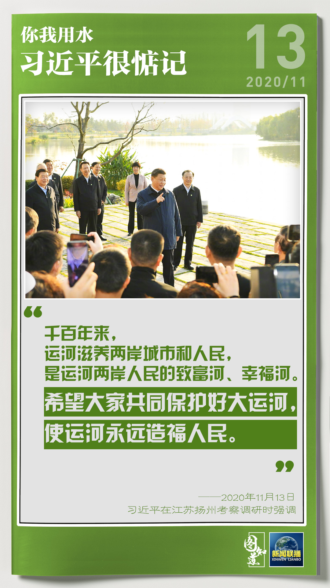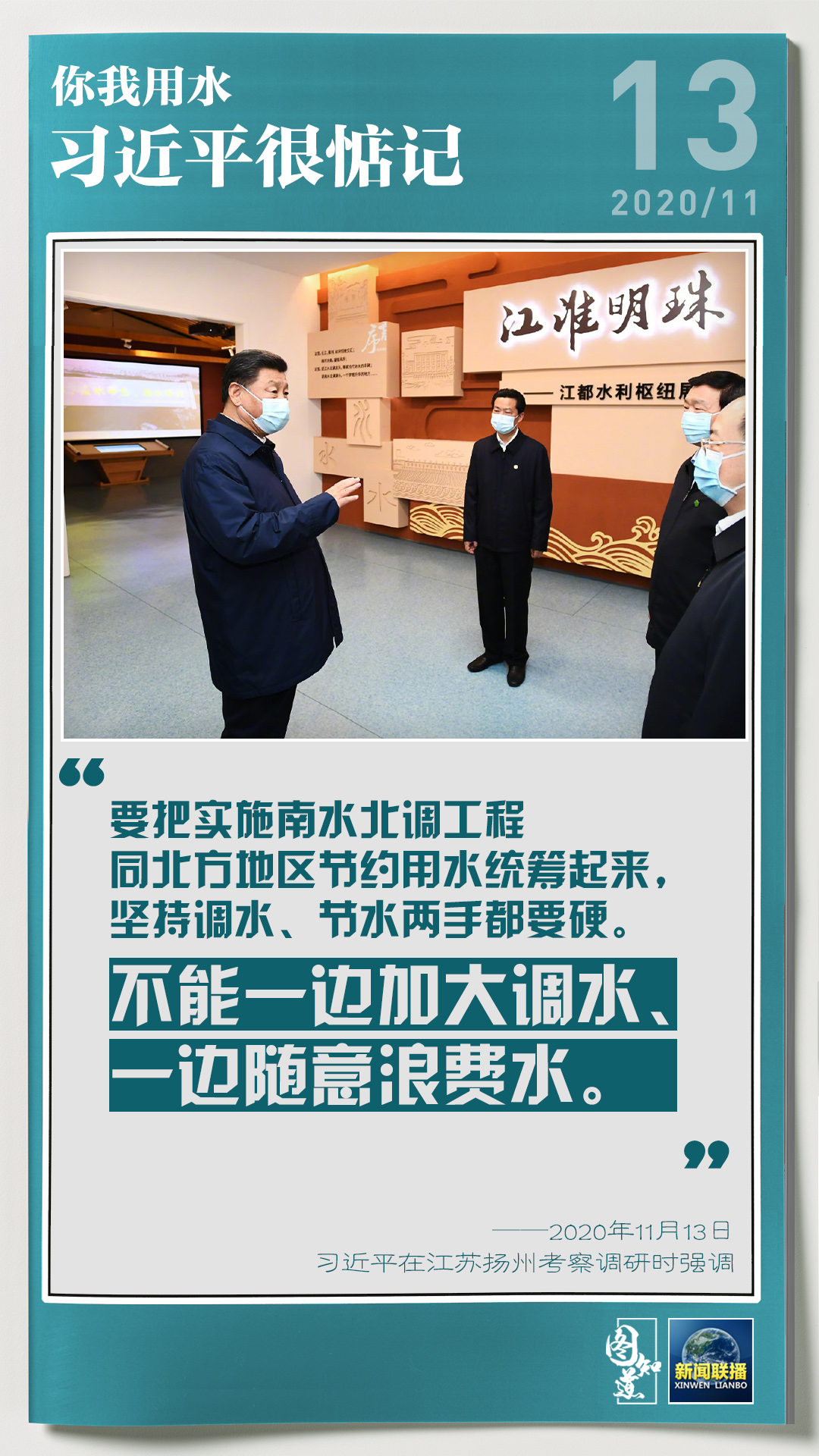 13日,習(xí)近平總書記在江蘇考察調(diào)研,了解南水北調(diào)東線工程和江都水利樞紐建設(shè)運行等情況。民生為上,治水為要。近年來,習(xí)近平始終牽掛著我們的生活生產(chǎn)用水問題,多次在不同場合作出重要指示、提出要求。