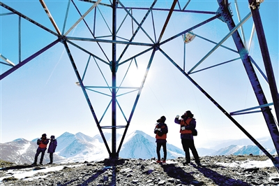 ▲國家電網(wǎng)西寧供電公司輸電運檢中心運檢人員在查看線路覆冰情況。記者 張龍 攝