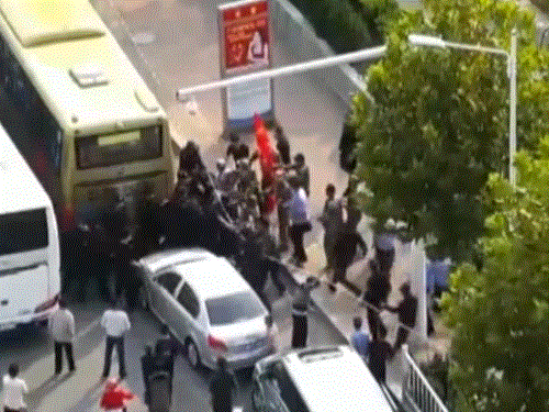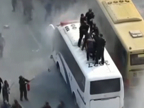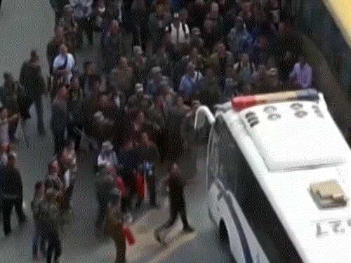 由于受干粉噴射,車內(nèi)執(zhí)勤民警和被帶離人員呼吸困難,被迫從車輛天窗口爬至車頂,現(xiàn)場聚集人員仍不甘心,繼續(xù)用滅火器噴射車頂上的民警并投擲石塊。