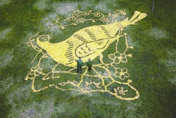 3日上午,郫都區(qū)置信逸都小區(qū)內(nèi),老何和搭檔花了近4個(gè)小時(shí)在小區(qū)中庭的大草地上“畫”出了一幅銀杏新作——臘梅花開枝頭,畫眉回眸而棲!斑要再改改,看上去全是線條!崩虾螌(duì)這幅銀杏圖不是很滿意。吃過(guò)午飯,他讓搭檔老王再去拉些銀杏葉來(lái),“把畫眉用葉子填滿,把線條用草地本身體現(xiàn),讓它更渾然一體,更有沖擊力!