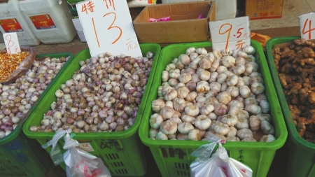 記者在其他菜市場發(fā)現(xiàn),10元一斤已是普通大蒜的最低零售價(jià),而紫皮獨(dú)瓣蒜價(jià)格已經(jīng)漲到了13元一斤。在一家大型超市,記者發(fā)現(xiàn),普通大蒜價(jià)格為10.8元一斤,獨(dú)瓣蒜價(jià)格更是高達(dá)16元一斤。