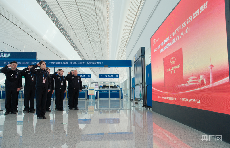 山東濟南出入境邊防檢查站執(zhí)勤民警在國門一線開展宣誓活動,切實履行法定職責,全力維護憲法權威。