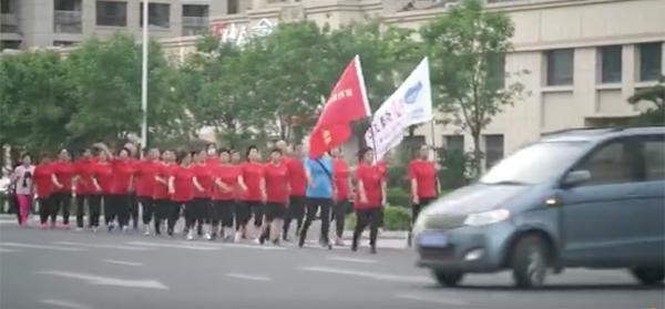 青島市李滄區(qū)的“馬路暴走團”:每晚6點后,數(shù)十名中老年人統(tǒng)一著裝,排著整齊的隊伍,放著勁爆的音樂在雙向八車道的機動車道上甩手疾走。